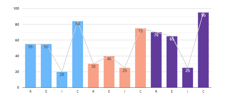 Porque Características sobresalientes (Comportamiento diario) sigue una regla interna de buscar una diferencia de al menos 30 puntos entre cada una de las letras, cuando la encuentra saldrá esa combinación, usemos el siguiente ejemplo: Tenemos en comportamiento diario las siguientes puntuaciones: R 50, E 80, I 28, C 40. Al buscar las diferencias de 30 puntos, tenemos que 80-50= 30 por lo cual tendremos la combinación de E/R siempre se pone primero la letra más alta, 80-28= 52 combinación de E/I 80-40= 40 E/C 50-40= 10 por lo tanto no cumple el requisito y no se muestra como combinación, 50-28= 22 de igual forma no cumple el requisito. El texto que nos aparece con estas combinaciones son las características de este tipo de comportamientos, adicional nos harán comentarios sobre si se combina con un I+ o un I- solo haremos caso cuando si aplique a nuestro candidato. El + y el – solo aparecerá en Limitaciones bajo presión y en Motivaciones, y muy raras ocasiones en características sobresalientes, ya que solo si no cumple el requisito de la diferencia de 30 puntos pudiera salir una letra con un + o – dependiendo del caso.